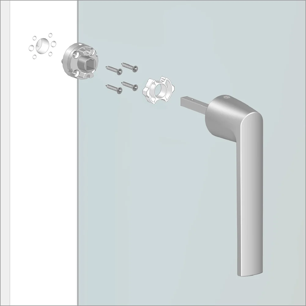 Az ablakprofil speciális előkészítést igényel a HOPPE kompakt ablakkilincsek felszereléséhez. Két furatba kell helyezni az alsó rész csapjait, amelyek megakadályozzák a nem kívánt elfordulást működés közben. Négy további csavar rögzíti az alsó részt, és biztosítja, hogy szilárdan illeszkedjen az alumínium, fa és műanyag ablakprofilokhoz.