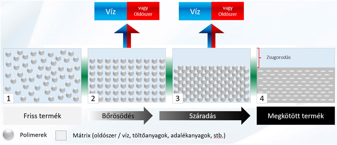 A fizikai úton kötő ragasztók általában úgy működnek, hogy az előzetesen összekevert és elkészített ragasztók, valamilyen folyadékkal vannak dúsítva, amely az alkalmazás során kipárolog az anyagból. Ezek lehetnek diszperziós ragasztók, ahol vízzel van dúsítva az anyag és ezáltal víz párolog ki az alkalmazás során, valamint vannak az oldószeres ragasztók, amelyek során nem víz, hanem valamilyen oldószer válik ki a kötés során, ezért ezeknek a ragasztóknak a kötés során szúrós, kellemetlen szaguk van. Ahogy a lenti ábrán is látszik az egyik legnagyobb hátránya ezen ragasztóknak, hogy a száradás után a ragasztó térfogata csökken a filmréteg kialakulásával, hiszen amikor kinyomtuk még benne volt az az anyag, ami a kötés során kipárolgott.