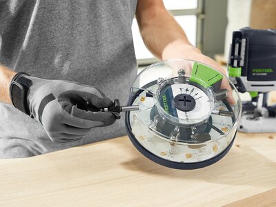 Egy újabb okos újdonsággal bővült az OF 1010 REBQ (2021. szeptemberétől előállított) tartozékainak palettája: a LED-es világítógyűrűvel. A gyűrű egyszerűen, utólag beépíthető, amely minden oldalról árnyékmentes megvilágítást biztosít két fényerősségben. Közvetlenül a talpba épített, közel van a munkadarabhoz. Helyezze be a világítógyűrűt az alapba és kattintson az akkumulátoregységre! A lámpa a marón marad, az akkumulátoregység szükség szerint eltávolítható, a szerszámról leválasztva is tölthető. Az integrált USB-C interfésznek köszönhetően könnyen újratölthető, akár hat órányi fényt biztosít.